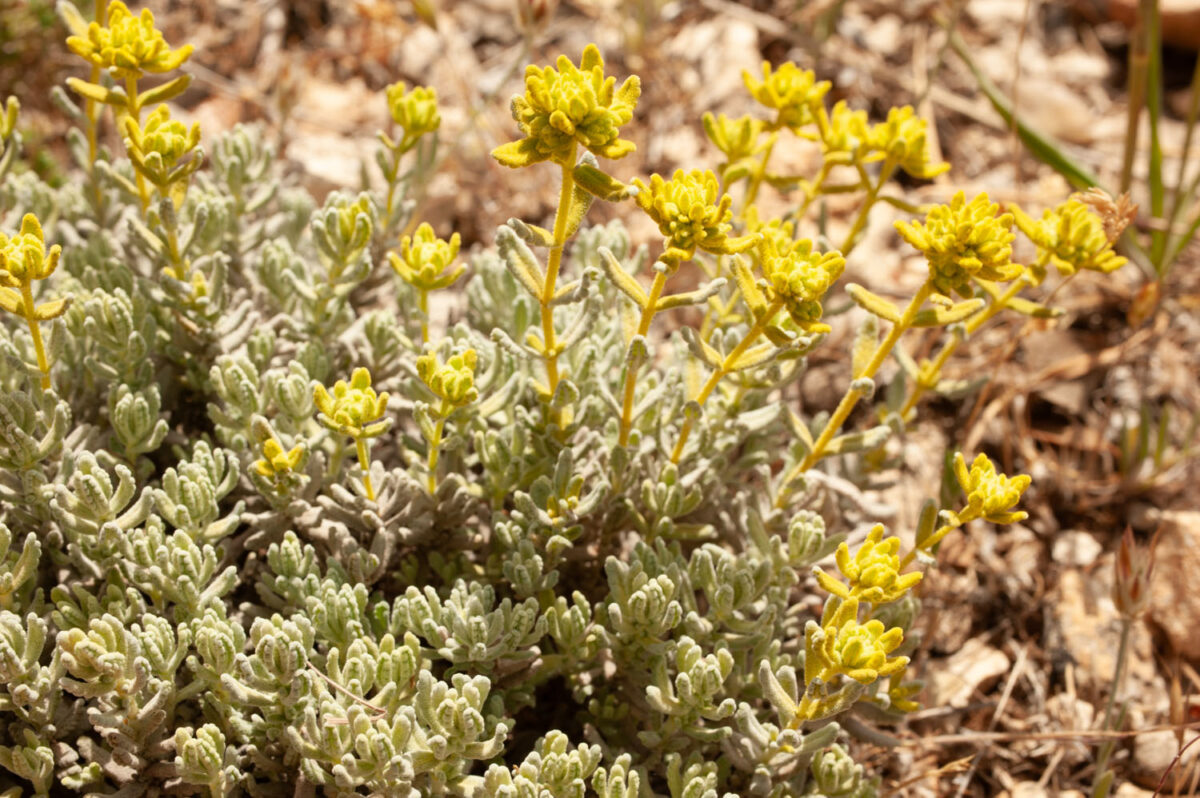 Mata con pelos cortos y muy ramificados, de ramas cortas y rectas (pelos dendríticos). Tallos con dimorfismo estacional, los vegetativos grisáceos y los floríferos amarillos o verde–amarillentos. Hojas (8)10–11(12) x (1,5)2–3(4) mm, opuestas, sésiles, elípticas, lanceoladas o lineares, crenadas desde la mitad, revolutas. Inflorescencia en racimo de 3 cabezuelas. Flores zigomorfas, hermafroditas, pentámeras, sésiles. Cáliz 4–5 mm, tubular, con 5 dientes, 3 superiores ovado–triangulares con el central más ancho y 2 inferiores agudo–acuminados, divergentes, con pelos dendríticos. Corola 6–7 mm, unilabiada, amarilla; lóbulos 5, los latero–posteriores truncados y ciliados. Núculas 1–2(3), reticuladas