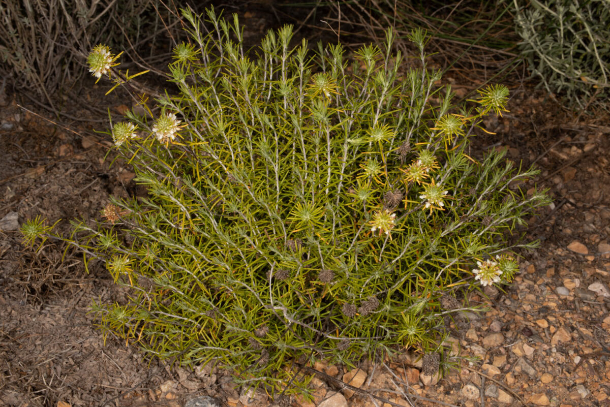 Tallos erectos, tomentosos, con indumento de pelos simples. Hojas (4,5)10–12(13) x (0,5)1–1,5(2,5) mm, opuestas, sésiles, lanceolado–lineares o lineares, cuneadas, enteras, revolutas, verdes, glandulosas. Inflorescencia en cabezuela terminal esférica u ovoide; bractéolas ovado–lanceoladas o lanceolado–lineares, acuminadas, cuspidadas o mucronadas, glabras, las basales tan largas o más que las flores, las distales y apicales casi tan largas o más cortas. Flores zigomorfas, hermafroditas, pentámeras. Cáliz 4,5–5 mm, tubular–campanulado, con 5 dientes mucronados, 3 superiores triangular–ovados, cuspidados, el central más ancho, y 2 inferiores triangular–agudos, glabrescente, glanduloso. Corola (7)9–10(12) mm, unilabiada, blanca o rosácea; lóbulos latero–posteriores glabros