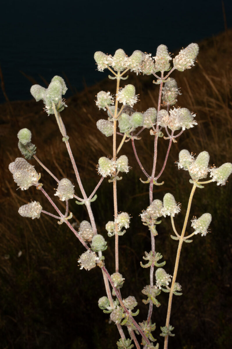Tallos floríferos ascendentes o dispuestos tortuosamente, pubescentes, con pelos ramificados. Hojas 4–10 x 1–4 mm, opuestas, arqueadas o rectas, lanceolado–lineares o lineares, crenadas desde el tercio inferior, revolutas. Inflorescencia en pseudo–panícula o pseudo–corimbo de cabezuelas esféricas, ligeramente deprimidas. Flores zigomorfas, hermafroditas o femeninas (ginodioecia), pentámeras. Cáliz 3–3,5(4) mm, tubular, con 5 dientes < 1 mm, triangular–obtusos, 3 superiores con el central más ancho que alto o equilateral y 2 inferiores agudos. Corola 3,5–4(4,5) mm, unilabiada, blanca, crema, rosácea o púrpura; lóbulos 5, los latero–posteriores oblongos y ciliados. Núculas 1–2(3), reticuladas
