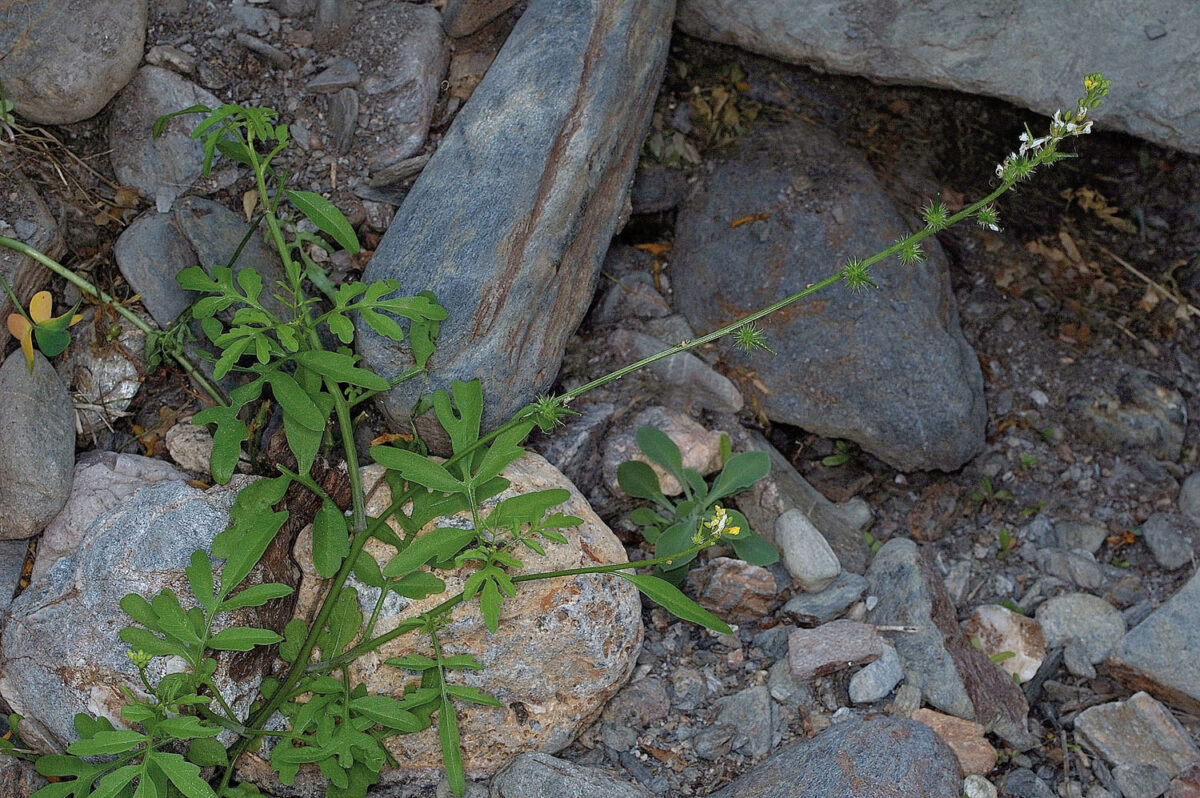 Tallo ramificado, con ramas de erectas a flexuo-sas, glabras o con algún pelo simple. Hojas 1,5–20 x 1–12 cm, alternas, pecioladas, de pinnatipartidas a bipinnatisectas, con hasta 4 pares de segmentos laterales, apiculados, de margen esparcidamente ciliado. Racimos ebracteados, laxos, con 14–30 flores. Flores actinomorfas, hermafroditas, tetrámeras; sépalos 3–4 mm, erectos; pétalos 6–9 x 2–3 mm, espatulados, amarillos, con venas más oscuras; estambres 6, tetra-dínamos. Frutos en silícula, con 2 artejos, el inferior de 5–7 mm de diámetro, subgloboso, cubierto de espinas cónicas de 1–3 mm, dehis-cente, con 2 lóculos monospermos; y el superior (rostro) 5–9 mm, estrechamente cónico. Semillas 2–2,5 mm, subesferoidales, finamente alveoladas, negruzcas