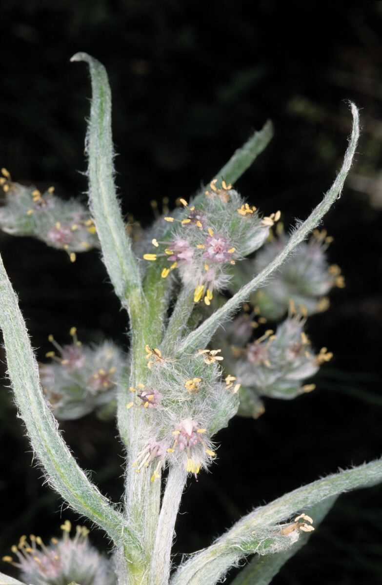 Uni o multicaule, blanquecina, con indumento de pelos poco rígidos y ± aplicados. Tallos ramificados en la parte superior. Hojas inferiores hasta 30 x 2 cm, lineares o linear–lanceoladas, las medias y superiores ± lineares. Cimas ebracteadas. Flores actinomorfas, hermafroditas, pentámeras. Cáliz dividido casi hasta la base, con lóbulos de 4–6 mm en la floración, lineares o linear–lanceolados. Corola 6–8,5 mm, rosada, con lóbulos anchos, cortos y reflejos, y 5 invaginaciones en la garganta. Estambres con filamentos de 7,5–9,5 mm y anteras marcadamente exertas. Estilo exerto. Núculas 7–9 mm, con cara externa escasamente gloquidiada y margen engrosado con varias filas de gloquidios algo aplastados