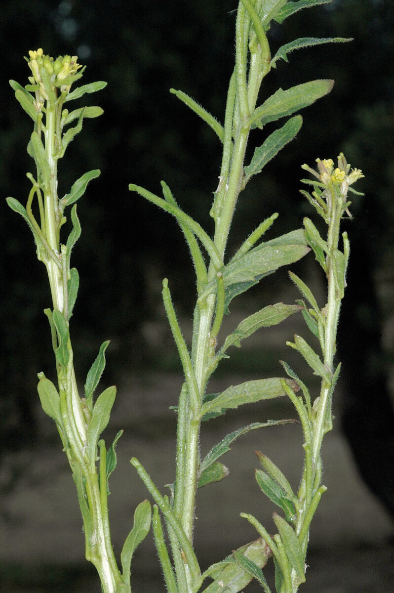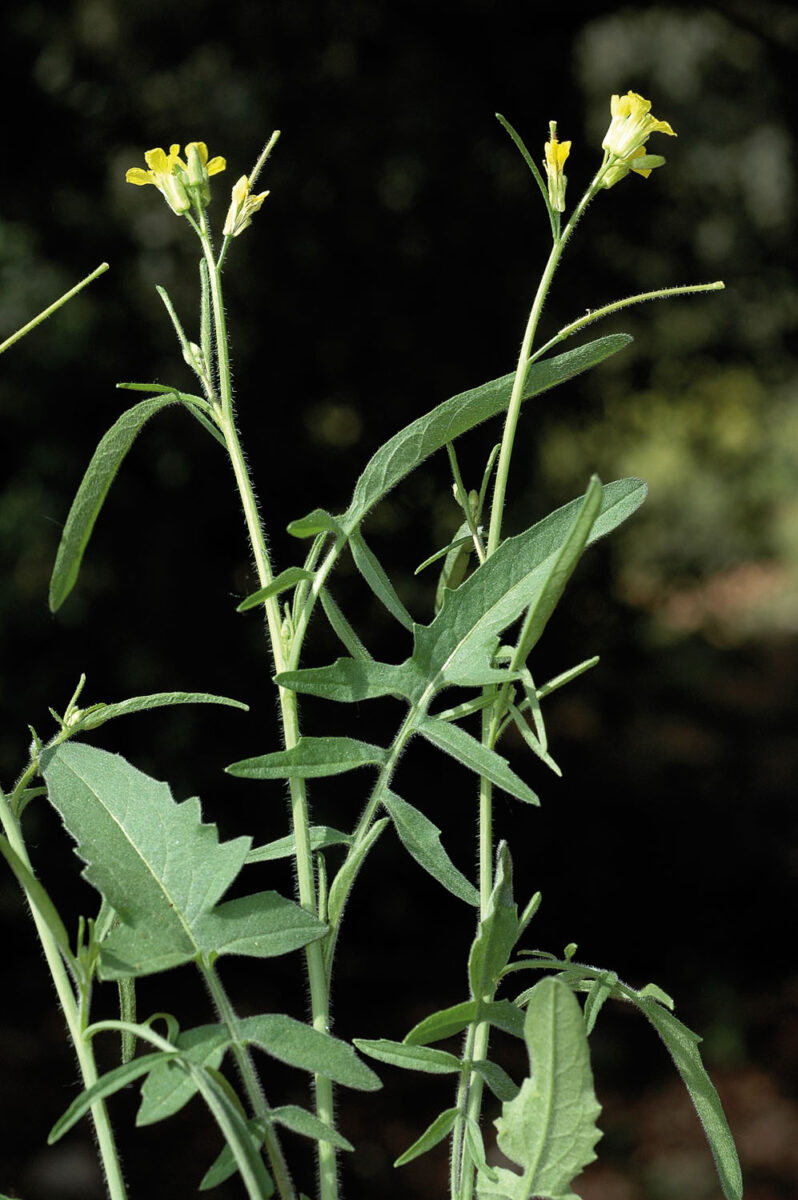 Hierba anual, pubescente, grisácea. Tallo erecto, simple o ramificado, folioso. Hojas basales 2,8–15 x 0,5–2,3 cm, runcinado–pinnatipartidas, con segmentos obovado–lanceolados, el terminal más grande; las medias y superiores más pequeñas, generalmente hastadas, con segmentos linear–lanceolados, el terminal mucho más grande. Racimos ebracteados, paucifloros, que se alargan en la fructificación. Flores actinomorfas, hermafroditas, tetrámeras; sépalos 4,8–6 mm, erectos, los medianos escasamente cuculados, pelosos; pétalos 6–9(10) mm, amarillos; estambres 6, tetradínamos; ovario súpero, con numerosos primordios por lóculo. Frutos en silicua, de 40–115 mm, rectos o ligeramente arqueados, pelosos o glabrescentes; valvas con 3 nervios marcados; pedicelos 4–7 mm, erecto–patentes, cilíndricos, casi tan anchos como el fruto