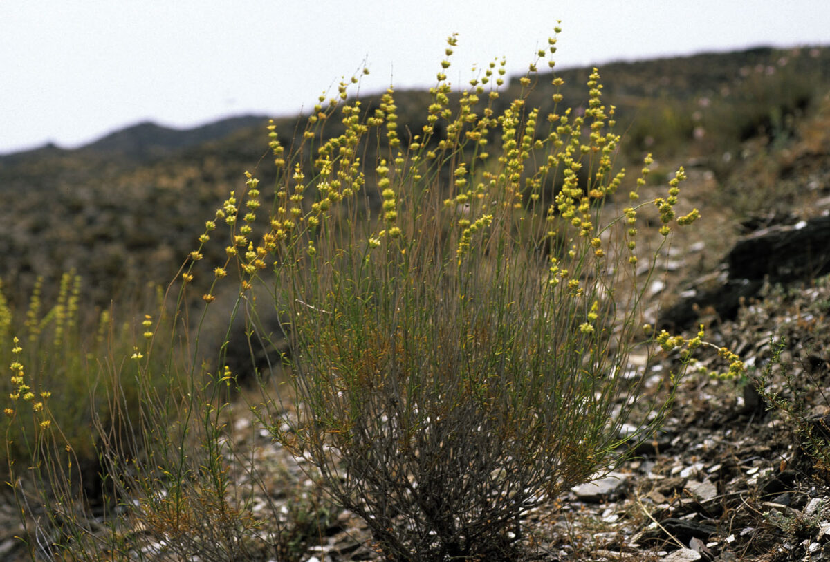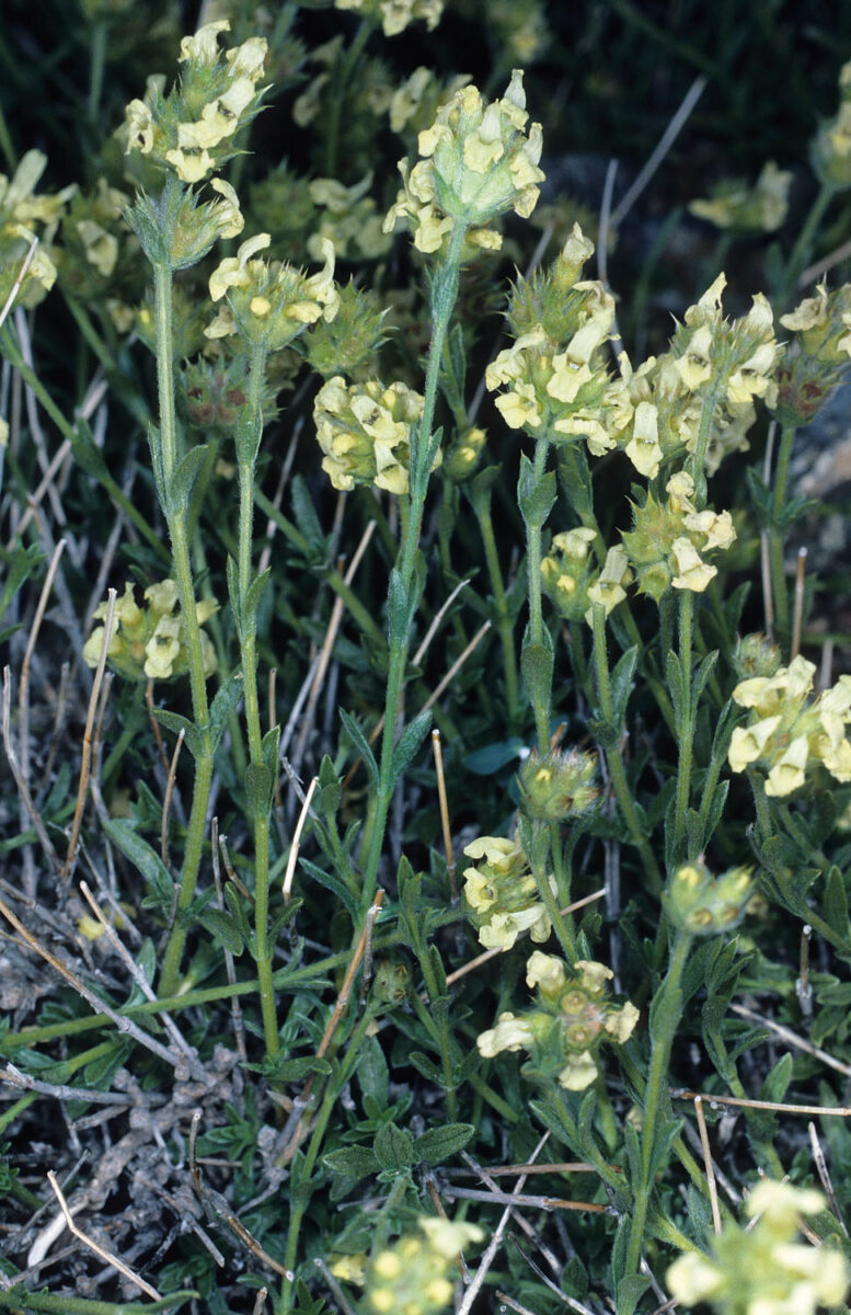 Tallos de corteza ± lisa, gráciles, con pelos dispersos doblados en ángulo de 90º, antrorsos. Hojas 7–24 x 0,5–1,5 mm, de lineares a lanceoladas, mucronadas, con la misma pilosidad que los tallos, las inferiores más anchas. Inflorescencia en cabezuela, formada por pocos verticilastros de 6 flores cada uno. Brácteas 5,5–9 x 3,5–4,5 mm, ovadas, enteras o con 1–3(5) dientes laterales, mucronadas, en general dispersamente pelosas. Cáliz 6,5–8 mm, que sobresale de las brácteas; dientes c. 2 mm, pelosos y con glándulas esferoidales amarillas muy pequeñas. Corola bilabiada, amarilla; labio superior 3–4 mm e inferior 2,5–3 mm