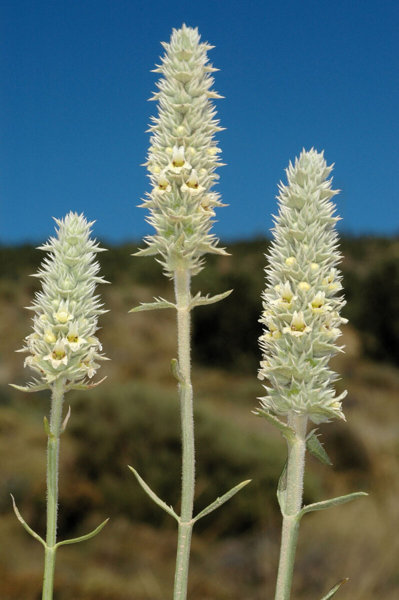 Tallos junciformes, verdes, glabros abajo. Hojas 20–26 x 2–2,5 mm, lineares o lanceoladas, escasas, caedizas, con 1–4 dientes incipientes hacia el ápice. Inflorescencia 1,5–20(23,5) x 1,2–1,7 cm, compacta, cilíndrica, espiciforme, punzante debido a los dientes subespinosos de las brácteas y del cáliz. Brácteas 6–8 x 8,5–12,2 mm, lanosas, anchamente ovadas, con 5–8 dientes de 2–2,5 mm a cada lado. Cáliz 6–7 mm, campanulado con dientes subiguales, lanosos, con carpostegio. Corola c. 6 mm, que no sobresale del cáliz, bilabiada, amarilla; labio superior dividido a veces púrpura por dentro y algo peloso, el inferior trilobulado. Núculas 1,3–1,5 x 1,6–2,2 mm, de ovoides a subtrígonas