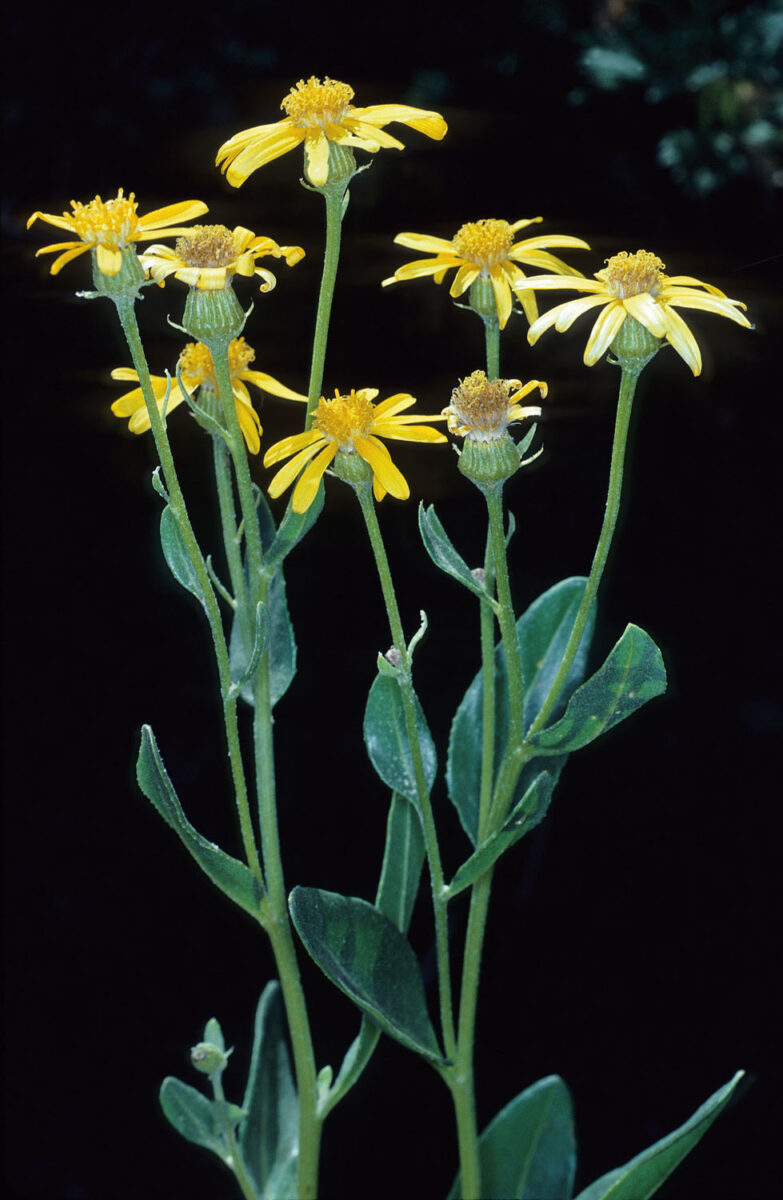 Vivaz, rizomatosa, ligeramente lanuginosa o glabrescente. Tallos erectos, simples y monocéfalos o ramificados solo en la inflorescencia. Hojas de 15–35 mm de anchura, alternas, elípticas u obovadas, sinuado–denticuladas o subenteras, coriáceas, pecioladas; las superiores oblongas o lanceoladas, sésiles. Capítulos 25–40 mm de diámetro, radiados, anchamente campanulados, solitarios o 2–8 en corimbos laxos; involucelo con 4–10 bractéolas linear–lanceoladas, de ápice negruzco; brácteas involucrales 5,5–7 mm, oblongo–lineares, de ápice negruzco; receptáculo desnudo. Flores amarillas, las externas 12–16, hemiliguladas, con limbo de 9–12 mm; las internas flosculosas, hermafroditas. Aquenios 4–5 mm, oblongoideos, costillados, glabros; vilano 7,5–9 mm, de pelos escabriúsculos, caedizos