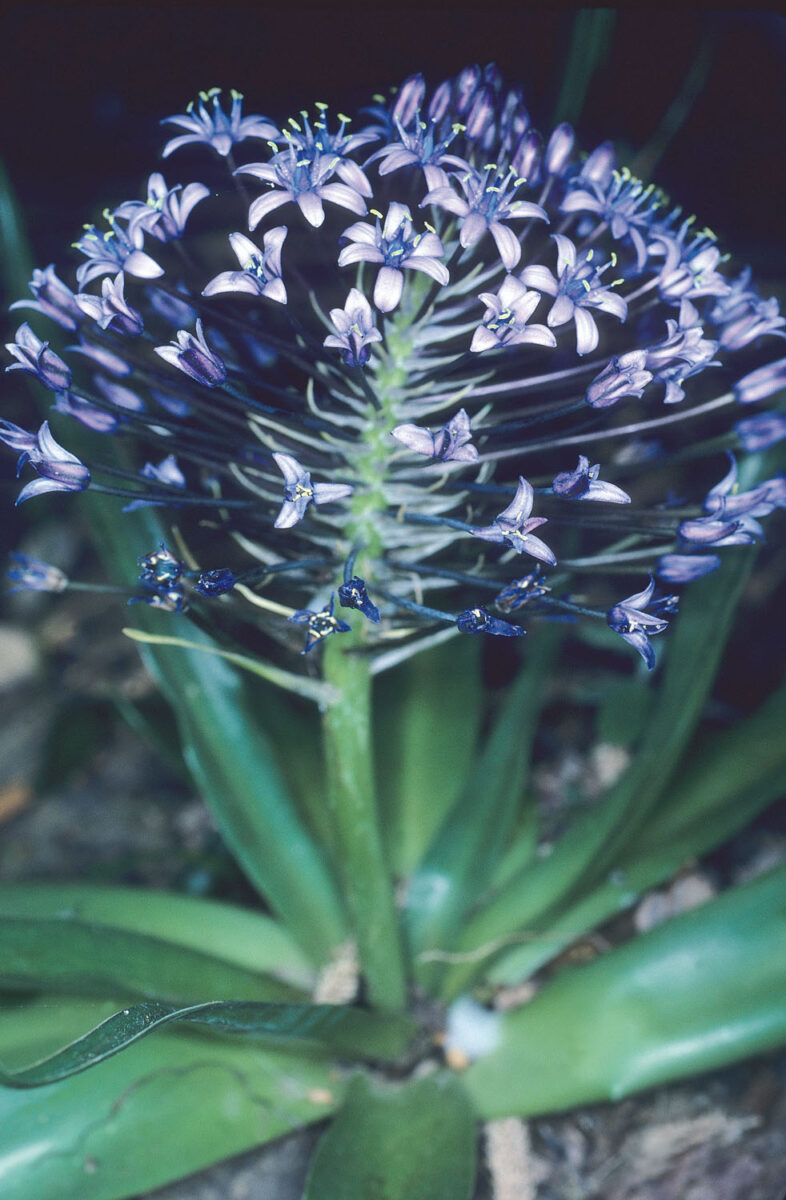 Bulbo 4–6 x 3,5–4,5 cm, envuelto por túnicas pardas. Escapo 40–90 cm. Hojas 3–10, de 30–50 x (1)2–3 cm, planas, agudas. Inflorescencia en racimo, de hasta 50 x 6 cm, subcilíndrica, con numerosas flores bracteadas; brácteas 0,5–1,5 mm, ovadas, mucho más cortas que los pedicelos. Flores actinomorfas, hermafroditas, trímeras, con perigonio estrellado; tépalos 5,5–7,5 x c. 2 mm, de color azul–violáceo; estambres 6; ovario súpero. Cápsula subglobosa