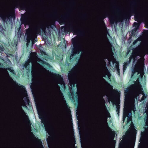 Anual. Tallos gráciles, erectos, ± simples, rojizos, con pelos tectores y glandulíferos. Hojas (4)6–15 x 3–10 mm, ovales, regularmente pinnatipartidas, hirsutas. Inflorescencia en racimo espiciforme, denso; brácteas más cortas que el cáliz, pinnatífidas o pinnatipartidas, glandulosas. Flores zigomorfas, hermafroditas, pentámeras, subsésiles; cáliz 6–8 x 1,5–2,5 mm, hendido hasta ⅓–¼, con 4 lóbulos de c. 1,5 mm, muy acrescentes (c. 13 mm en la fructificación); corola 8–10 mm, bilabiada, ocn labio superior galea-do y lóbulos del labio inferior enteros, ± persistente, glandulosa, rojo–púrpura por fuera, blanca por dentro. Cápsula 7–8 x 1,5–2,5 mm, ovoideo–elipsoide, aguda, más larga que el tubo del cáliz, glabra; semillas 0,3–0,4 mm, elipsoides, sublisas, pardo–rojizas