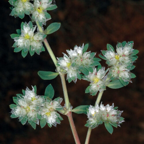 Planta con tallos y hojas generalmente rojizos. Tallos ramificados en la base, procumbentes, con una franja de pelos retrorsos; entrenudos de hasta 3 cm. Hojas 3–15 x 1–6 mm, opuestas, oblanceoladas, elípticas u ovales, agudas o subobtusas, mucronadas, uninervadas, pubérulas o glabrescentes, ciliadas en el margen; estípulas ovado–acuminadas, escariosas. Inflorescencias en glomérulos de 10–20 mm de diámetro, axilares y terminales; brácteas interflorales plateado–escariosas ocultando totalmente a las flores. Flores actinomorfas, hermafroditas, pentámeras, períginas. Sépalos 1,5–2,5 mm, iguales, oblongos, cuculados, con ancho margen escarioso y pequeña arista dorsal, glabros o pubescentes. Aquenio subgloboso, papiloso