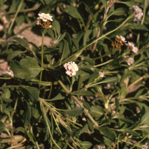 Herbácea o algo lignificada en la base, con tallos ramificados enraizantes en los nudos, ligeramente pubescentes. Hojas 2–5 x 0,5–1,8 cm, con pecíolo de 1–3 mm, decusadas, de obovadas a rómbicas, lanceoladas o espatuladas, cuneadas, de ápice redondeado u obtuso y margen aserrado en la parte superior, ± pelosas. Inflorescencias hasta 1 cm, en espigas axilares, capituliformes, de globosas a cilíndricas, densas, largamente pedunculadas; brácteas hasta 3 mm, más anchas que largas, de ampliamente obovadas a cordadas, no o escasamente carinadas. Flores zigomorfas, hermafroditas, pentámeras. Cáliz 1–1,5 mm, dividido casi hasta la base en 2 lóbulos membranáceos. Corola 2–3 mm, bilabiada, con lóbulos desiguales, de color blanquecino o algo violáceo. Estambres 4, didínamos. Fruto esquizocarpo, con 2 núculas