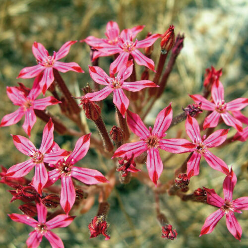 Herbácea, carnosa, pubescente–glandulosa. Tallos débiles, generalmente simples. Hojas 6–14 mm, alternas, carnosas, sésiles, subcilíndricas u ovoideas, generalmente caducas. Inflorescencia cimosa, corimbiforme, terminal, con ramillas flexuosas. Flores actinomorfas, hermafroditas, pentámeras. Sépalos 1–2 mm, soldados en la base o casi libres, lineares o triangular–lanceolados. Corola 10–25 mm, hipocraterimorfa, pubescente–glandulosa, rosada o rojiza, con tubo cilíndrico o algo estrechado hacia la parte superior; lóbulos 4–6 mm, ovado–lanceolados, agudos, con nervio medio más oscuro. Estambres 10, soldados al tubo de la corola, exertos. Carpelos 5, libres o algo soldados. Fruto polifolículo; semillas 0,2–0,4 mm, elipsoideas, estriadas