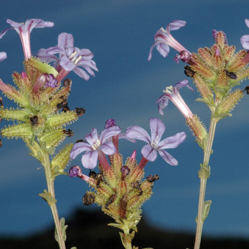Tallos estriados, muy ramificados en la parte superior. Hojas hasta 8 x 2,6 cm, alternas, muy variables en tamaño y forma; las inferiores ovadas u obovadas, amplexicaules, glandulosas en el margen; las superiores más pequeñas, sésiles, lanceoladas, con base cordada, glandulosas por ambas caras. Inflorescencias espiciformes, terminales, ± densas. Flores hasta 15 mm de longitud, actinomorfas, hermafroditas, pentámeras, con 3 brácteas herbáceas, la inferior c. 5 mm y las dos laterales c. 2,5 mm. Cáliz (5)5,5–7 mm, tubular, glanduloso. Corola de longitud al menos el doble que la del cáliz, tubuloso–infundibuliforme, de color azul, violeta o rosado, más intenso en los nervios. Fruto aquenio, envuelto por el cáliz, con aspecto espinoso