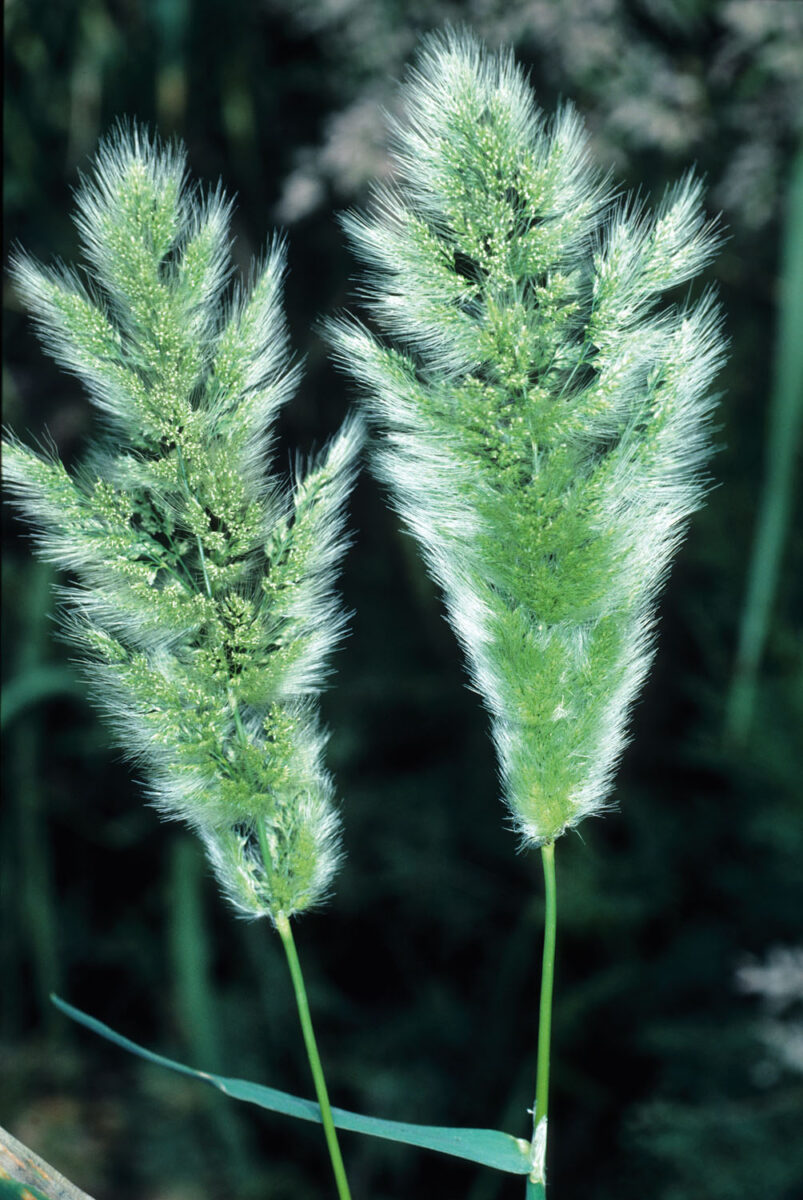 Lámina de las hojas hasta 24 cm x 13 mm, plana, glabra; lígula hasta 10 mm, aguda u obtusa. Panícula hasta 16 cm, densa, compacta, sedosa, en ocasiones lobada y a veces envuelta por la vaina de la hoja superior. Espiguillas 1,8–2,5 mm, unifloras, comprimidas lateralmente; glumas iguales, oblongas, mucho más largas que la flor, dilatadas en la mitad inferior, de borde ciliado y ápice emarginado, con gruesos acúleos en la mitad inferior y en la quilla, con arista de 5–7 mm inserta entre los lóbulos; lema c. 1,1 mm, c. ½ de la longitud de las glumas, glabro, de ápice dentado, con arista de hasta 2 mm, terminal, que no sobresale de las glumas; pálea tan larga como el lema. Anteras c. 0,3 mm