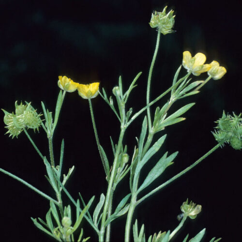 Raíces fibrosas, fasciculadas. Tallos erectos, ramificados, esparcidamente adpreso–pelosos. Hojas basales envainadoras, largamente pecioladas, cuneadas, de ápice dentado o lobado y/o tripartidas, con segmentos cuneados; hojas medias envainadoras, pecioladas, multífidas, las superiores más pequeñas. Flores 6–15 mm de diámetro, actinomorfas, hermafroditas, solitarias sobre largos pedúnculos opuestos a las hojas; sépalos 5, patentes, adpreso–pubescentes; pétalos 5, amarillos; estambres 10–15; gineceo apocárpico, súpero. Fruto poliaquenio, acabezuelado, laxo; receptáculo peloso; aquenios 5–7 mm, poco numerosos, con caras cubiertas de largas espinas y pico de 2–3 mm, terminal, filiforme