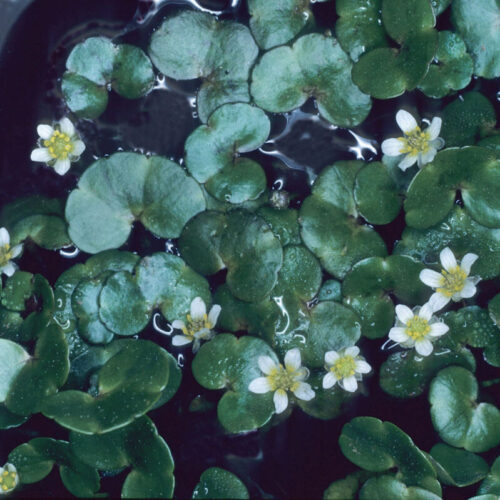 Raíces numerosas, fibrosas. Tallos postrados, con raicillas en los nudos, glabros. Hojas todas laminares, con limbo suborbicular o reniforme, cordado en la base, con 3–5 lóbulos poco marcados, lóbulos de las hojas más anchos en la base, con margen entero, largamente pecioladas, glabras; estípulas membranáceas, soldadas parcialmente al pecíolo. Flores 3,5–5 mm de diámetro, actinomorfas, hermafroditas, solitarias, sobre largos pedúnculos arqueados y opuestos a las hojas; sépalos 5, membranáceos, glabros, reflejos; pétalos 5, oblongos, blancos; estambres poco numerosos; gineceo apocárpico, súpero. Fruto poliaquenio, globoso; receptáculo glabro; aquenios con quilla dorsal, glabros, con estilo subterminal