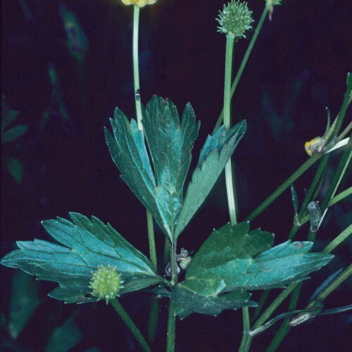 Cepa gruesa, con raíces cilíndricas y tallos estoloníferos que emiten raíces fibrosas desde los nudos. Tallos erguidos o ascendentes, estriados, fistulosos, ramificados en la parte superior, pelosos o glabrescentes. Hojas basales envainadoras, largamente pecioladas; limbo subpentagonal, 3–secto, con segmentos 2–3 lobados e irregularmente dentados, el central peciolulado; las caulinares más pequeñas. Cimas paucifloras, con 2–6 flores largamente pedunculadas. Flores 18–30(32) mm de diámetro, actinomorfas, hermafroditas; sépalos 5, patentes, adpreso–pelosos; pétalos 5, amarillos; estambres numerosos; gineceo apocárpico, súpero. Fruto poliaquenio, ovoideo, denso; receptáculo peloso; aquenios lenticulares, lisos, con margen aquillado y pico corto, subterminal, casi recto