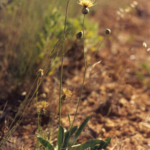 Vivaz, glabra, algo lanuginosa en la base. Tallos erectos, simples o ramificados en el tercio superior. Hojas alternas, aglomeradas cerca de la base, las basales rosuladas, pecioladas, oblanceoladas, aserrado–dentadas, las demás sésiles, de aserrado–dentadas a pinnatipartidas. Capítulos 1–3, terminales, solitarios, largamente pedunculados. Involucro 15–25 x 15–25 mm, subgloboso; brácteas glabras, con estrías negruzcas cerca del ápice y reborde escarioso decurrente. Flores flosculosas, amarillo–pálidas, las externas neutras. Aquenios 4–5 mm; vilano doble, el externo 10–11 mm, ferruginoso