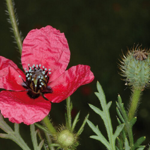 Uno o varios tallos, simples o más frecuentemente con ramas ascendentes, foliosos, híspidos. Hojas basales largamente pecioladas, bi o tripinnatipartidas, con segmentos linear–lanceolados, aristados; las caulinares subsésiles, similares a las basales, todas híspidas. Flores solitarias, actinomorfas, hermafroditas, sobre pedúnculos axilares recios, híspidos o con pelos adpresos. Sépalos 2, híspidos. Pétalos 4, de 1,5–2 x 0,5–1 cm, obovoideos, rojizos, generalmente con mancha negra. Estambres numerosos, de filamentos ensanchadados gradualmente y anteras azuladas. Ovario súpero. Cápsula 8–12(15) x 5–8(10) mm, subglobosa, cubierta de setas arqueado–ascendentes; disco estigmático con 6–9 radios, convexo