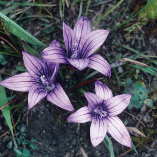 Tuberobulbo 1–1,5(2) cm de anchura, con túnicas coriáceas, lisas, pardas, a veces 2–3 superpuestos en sentido vertical. Escapo (1)2–6(11) cm, rodeado en la base por vainas membranáceas pardo–claras. Hojas 3–5, de hasta 20 cm x 1–1,5 mm, más largas que el escapo, lineares, canaliculadas, ± curvadas. Brácteas 1,3–2 cm, lanceoladas, herbáceas, con margen escarioso muy estrecho; bractéolas lanceolado–elípticas, escariosas, con máculas pardas a violáceas y una carina central verde y conspicua. Flores (1)2–3(5), pediceladas, actinomorfas, hermafroditas, trímeras. Perianto (15)20–30(35) mm, infundibuliforme, con tubo corto; tépalos de color violeta pálido u oscuro, con base amarillenta y nervios oscuros. Estambres 3; anteras 3–4(5) mm. Ovario epigeo; estigmas claramente más largos que los estambres. Cápsulas obovoideas o piriformes