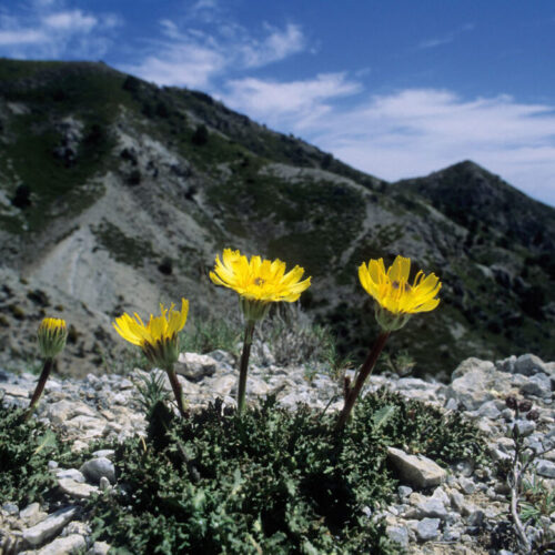 Vivaz, escaposa, glabrescente, glauca. Tallos 1–2(3), simples, generalmente solo con hojas bracteiformes y remotas. Hojas basales rosuladas, pecioladas, obovado–oblongas, pinnatífidas o pinnatipartidas, con lóbulos dentados y crespos. Capítulos 2–5 cm de diámetro, homógamos, terminales, solitarios, largamente pedunculados; involucro con varias filas de brácteas, de margen escarioso; receptáculo con escamas interseminales lineares, subuladas. Flores liguladas, amarillas, con 5 dientes de ápice negruzco. Aquenios 4–5 mm, turbinados, con 8–10 costillas; vilano 1,2–3,5 mm, con 5–6 escamas ovadas o lanceoladas