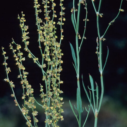 Dioica, con rizoma robusto, a veces estolonífera, glabra, verde o algo glauca. Tallos numerosos, erectos. Hojas (1,5)11–62 x 1,5–15 mm, alternas, simples, hastadas o sagitadas, muy polimorfas, de lineares a ovadas, largamente pecioladas, con lóbulos basales divergentes, raramente bífidos. Inflorescencia racemosa, larga, ramificada. Flores actinomorfas, unisexuales, homoclamídeas. Tépalos 6, verdosos; los 3 externos soldados en la base, los internos libres, transformándose en 3 valvas soldadas al fruto y tan largas como éste. Estambres 6; anteras 0,7–1,5 mm. Ovario súpero. Aquenio (0,6)1–1,6(1,8) x (0,5)0,8–1,2(1,4) mm