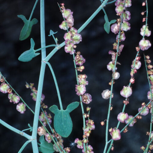 Polígama, rizomatosa, glabra, muy glauca. Tallos numerosos, muy ramificados, erectos. Hojas (4)10–38(42) x (4)5–25(40) mm, alternas, simples, hastadas o sagitadas, ovadas, lanceoladas o suborbiculares, frecuentemente estrechadas por encima de los lóbulos basales, largamente pecioladas; lóbulos basales enteros, divergentes. Inflorescencia racemosa, muy ramificada, algo congesta. Flores actinomorfas, unisexuales o hermafroditas, homoclamídeas. Tépalos 6, verde–rosados; los 3 externos soldados en la base, usualmente reflejos en la fructificación, los internos libres, transformándose en 3 valvas que envuelven al fruto. Estambres 6; anteras 1–1,5 mm. Ovario súpero. Fruto aquenio, con valvas de 5–10 x 5–10,5 mm, suborbiculares, cordadas, a menudo rosadas