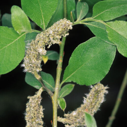 Arbusto alto o arbolillo dioico, de ramillas jóvenes pubescentes, las adultas glabras, castaño–rojizas o pardas; yemas glabrescentes o pubescentes. Hojas alternas, con pecíolo de c. 0,5 cm, peloso; limbo (4)6–7(10) x (2,5)3–4(6) cm, anchamente ovado u obovado, de haz glabro o glabrescente y envés densamente blanco–tomentoso, con ápice agudo, recurvado u obtuso, base redondeada y margen revoluto y entero, ocasionalmente sinuado; estípulas reniformes, caducas. Amentos precoces, ovoideos; brácteas ovado–lanceoladas, oscuras o discoloras con ápice oscuro, con pelos densos y blancos. Flores masculinas con 2 estambres, de filamentos libres, glabros o glabrescentes, y 1 nectario; las femeninas con pistilo pedicelado, pubes-cente, estilo corto, 2 estigmas marcadamente bífidos y 1 nectario. Cápsula pelosa