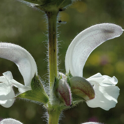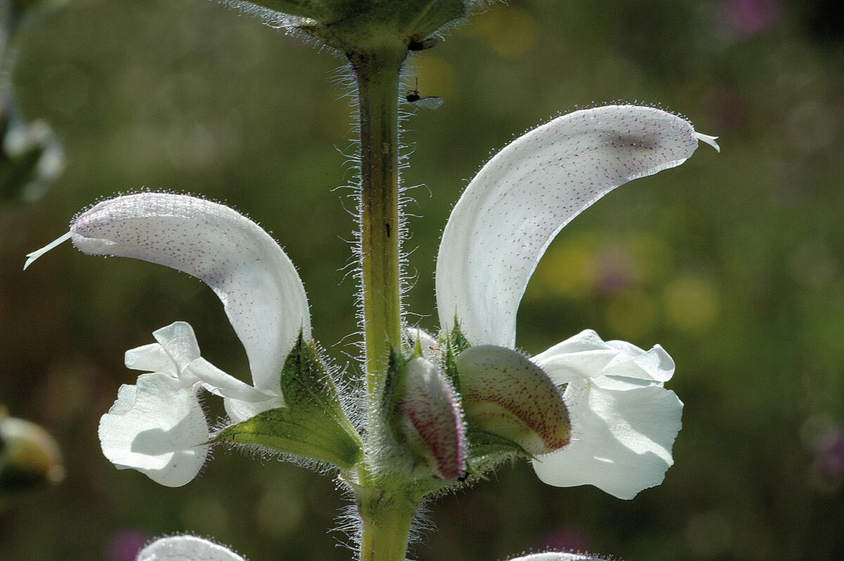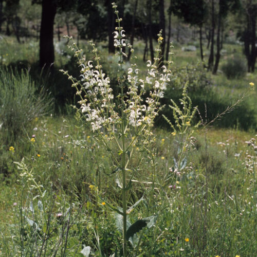 Planta con denso indumento de pelos tectores y glandulíferos. Hojas 10–40 x 6,5–20 cm, simples, pecioladas –las superiores sésiles–, en su mayoría basales, ovadas u ovado–oblongas, lobado–crenadas o dentadas. Inflorescencia ramificada, con verticilastros de 6–10 flores cada uno, ± distanciados; brácteas 8–30 x 8–19 mm, ovadas, verdosas, persistentes. Cáliz 7–11 mm, bilabiado, campanulado; labio superior con 3 dientes triangulares, espinescentes, el central más corto; labio inferior con 2 dientes estrechamente triangulares, espinescentes. Corola 17–22(26) mm, bilabiada, blanca o blanquecino–amarillenta; labio superior netamente falcado, comprimido lateralmente, en ocasiones de color rosa; labio inferior de color crema; tubo sin anillo de pelos en el interior. Estambres 2, con conectivo más largo que el filamento. Núculas subglobosas