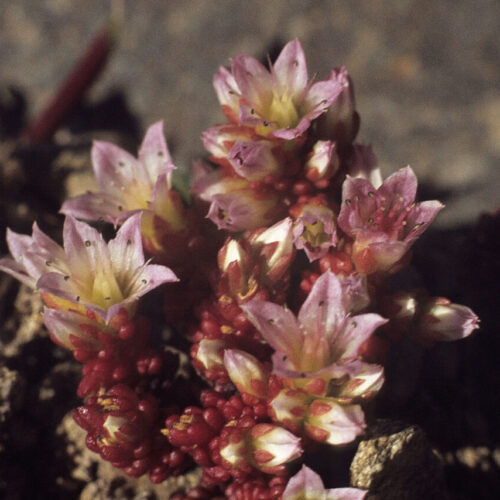 Glabra, rojiza, a veces verdosa, que suele aparecer en grupos numerosos. Tallo generalmente no ramificado, sin tallos estériles. Hojas 2,5–5 mm, casi siempre imbricadas, oblongas, obtusas. Flores hermafroditas, actinomorfas, pentámeras, hipóginas, subsésiles, a veces con pedicelo de hasta 3 mm. Sépalos 2,5–4 mm, glabros, lanceolados, agudos, algo soldados en la base. Pétalos 5–7 mm, rosado–purpúreos, soldados en la base, con segmentos ovado–acuminados, mucronados. Estambres 10; anteras moradas. Folículos c. 3 mm, glabros, de color castaño; semillas diminutas, pardas