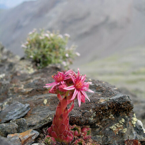 Herbácea, carnosa, pubescente, con rosetas monocárpicas, estolonífera. Tallos floríferos simples, erectos, gruesos, rojizos, foliosos. Hojas alternas, sésiles, enteras, ciliadas, carnosas; las basales 10–30 mm, en rosetas de hasta 5 cm de diámetro, oblongo–lanceoladas u oblanceoladas, con limbo pubescente–glanduloso y ápice agudo y rojizo; las caulinares imbricadas, lanceoladas, rojizas. Inflorescencia cimosa, terminal, compacta, a menudo pauciflora. Flores 15–25 mm de diámetro, actinomorfas, hermafroditas, 9–11–meras, rosadas o purpúreas; sépalos soldados en la base, lanceolados, pubescentes; pétalos libres, patentes, linear–lanceolados, agudos; estambres en número doble al de pétalos. Fruto polifolículo