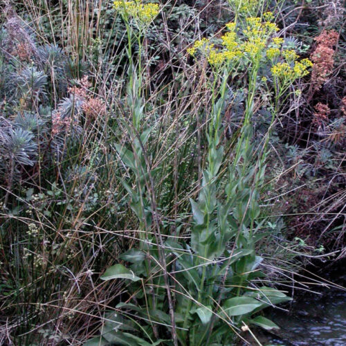 Vivaz, rizomatosa, verde– o blanco–lanuginosa. Tallos de 1 cm de diámetro o más, erectos, simples, robustos, fistulosos, ramificados solo en la inflorescencia. Hojas alternas, lanceoladas, u oblongo–lanceoladas, dentadas o denticuladas; las basales de hasta 40 cm, pecioladas; las superiores sésiles, hemiamplexicaules. Capítulos 10–15 mm de diámetro, radiados, campanulados, en gran número en corimbos compuestos terminales; involucelo con 6–12 bractéolas lanceoladas, subuladas; brácteas involucrales 5–6 mm, oblongo–lineares, de margen escarioso; receptáculo desnudo. Flores amarillas, las externas 5–7, hemiliguladas, con limbo de 4–5 mm; las internas flosculosas, hermafroditas. Aquenios 2,5–3,5 mm, oblongoideos, costillados, glabros; vilano (4,5)5–7 mm, de pelos tenues, escabriúsculos, caedizos