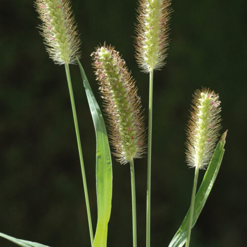 Hojas con vaina de márgenes glabros; lámina hasta 20 cm x 4–9 mm, con pelos largos en la base; lígula pelosa (pelos c. 0,7 mm). Panícula hasta 13 cm, espiciforme, muy contraída y densa, con raquis híspido. Espiguillas 2,5–3 mm, con pedúnculos cortos, rodeadas por 10–16 setas de 8–12 mm, con acúleos antrorsos, amarillo–doradas, que forman un ángulo de 75º–90º con el raquis; flores 2, la inferior estéril o masculina, membranácea, la superior hermafrodita y coriácea; glumas desiguales, membranáceas, la inferior 1–1,3 mm, trinervada, la superior 1,5–2 mm, con 5 nervios; lema de la flor inferior 2,4–2,9 mm, tan largo como la superior; lema de la flor superior con superficie transversalmente rugosa; pálea de ambas flores tan larga como los lemas. Anteras c.1 mm