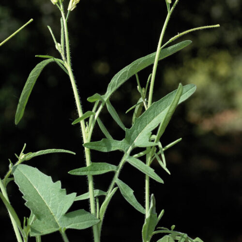 Hierba anual, pubescente, grisácea. Tallo erecto, simple o ramificado, folioso. Hojas basales 2,8–15 x 0,5–2,3 cm, runcinado–pinnatipartidas, con segmentos obovado–lanceolados, el terminal más grande; las medias y superiores más pequeñas, generalmente hastadas, con segmentos linear–lanceolados, el terminal mucho más grande. Racimos ebracteados, paucifloros, que se alargan en la fructificación. Flores actinomorfas, hermafroditas, tetrámeras; sépalos 4,8–6 mm, erectos, los medianos escasamente cuculados, pelosos; pétalos 6–9(10) mm, amarillos; estambres 6, tetradínamos; ovario súpero, con numerosos primordios por lóculo. Frutos en silicua, de 40–115 mm, rectos o ligeramente arqueados, pelosos o glabrescentes; valvas con 3 nervios marcados; pedicelos 4–7 mm, erecto–patentes, cilíndricos, casi tan anchos como el fruto