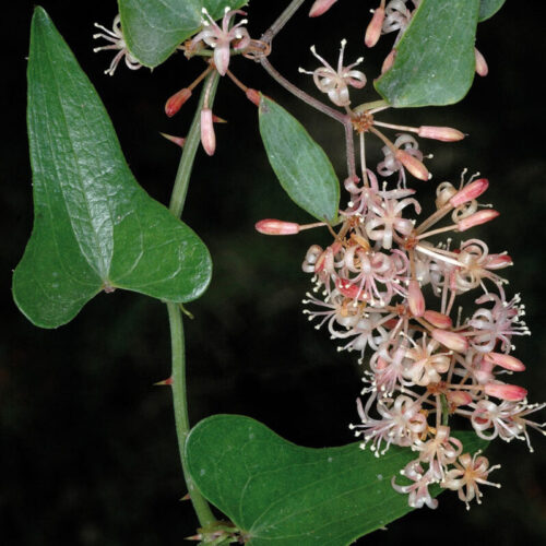 Rizomatosa, glabra, dioica. Tallo voluble, leñoso en la base, espinoso. Hojas alternas, simples, con pecíolo de 0,2–2 cm, espinoso o inerme y estípulas transformadas en zarcillos; limbo 4–9(13) x 1–6(14) cm, cordado, acuminado, coriáceo, lustroso, con varios nervios paralelos conectados por una nervadura reticulada y margen y nervio medio por el envés frecuentemente espinosos. Inflorescencias en umbelas, a menudo agrupadas sobre un eje flexible a modo de verticilos. Flores actinomorfas; tépalos 6, de 2,5–5 mm, libres, blanquecinos, con tintes amarillentos o rojizos; las masculinas con 6 estambres; las femeninas con estaminodios y ovario súpero tricarpelar. Bayas 5–8(10) mm, esféricas, negras o rojas