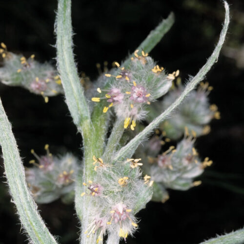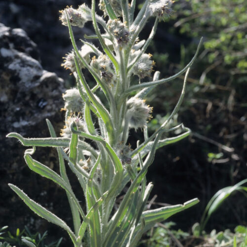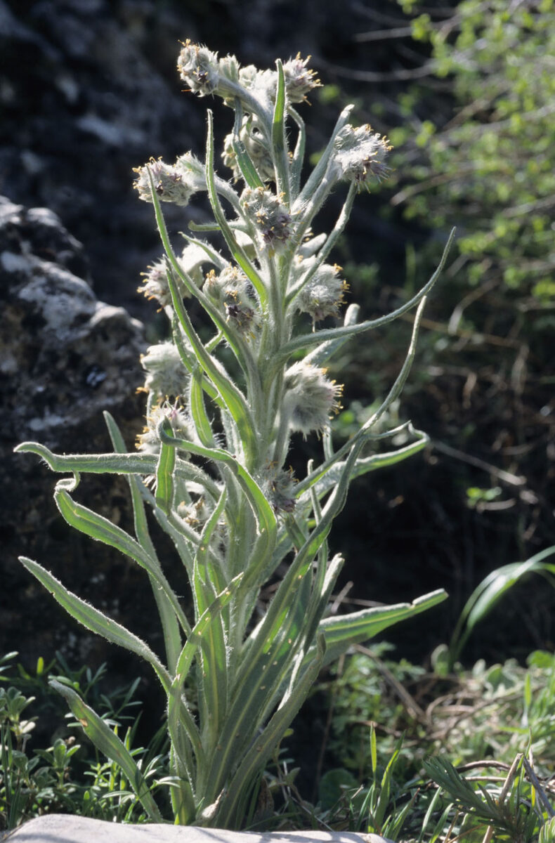 Uni o multicaule, blanquecina, con indumento de pelos poco rígidos y ± aplicados. Tallos ramificados en la parte superior. Hojas inferiores hasta 30 x 2 cm, lineares o linear–lanceoladas, las medias y superiores ± lineares. Cimas ebracteadas. Flores actinomorfas, hermafroditas, pentámeras. Cáliz dividido casi hasta la base, con lóbulos de 4–6 mm en la floración, lineares o linear–lanceolados. Corola 6–8,5 mm, rosada, con lóbulos anchos, cortos y reflejos, y 5 invaginaciones en la garganta. Estambres con filamentos de 7,5–9,5 mm y anteras marcadamente exertas. Estilo exerto. Núculas 7–9 mm, con cara externa escasamente gloquidiada y margen engrosado con varias filas de gloquidios algo aplastados