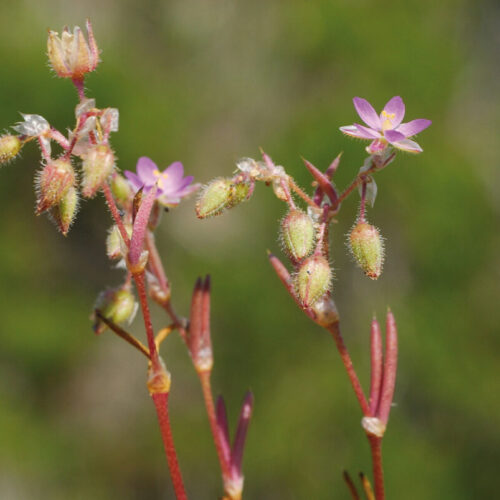 Planta glabra en la base, densamente pubescente–glandulosa en el resto. Tallos ramificados, robustos, con nudos muy marcados. Hojas 5–20 x 0,5–2 mm, opuestas, con fascículos axilares, lineares, mucronadas o múticas, algo crasas; estípulas anchamente triangulares, escariosas. Cimas de monocasios escorpioideas o de hasta 7 mm, erecto–patentes. Flores actinomorfas, hermafroditas, pentámeras. Sépalos 3,5–4,5 mm, ovales, obtusos, con ancho margen escarioso, densamente pubescente–glandulosos. Pétalos más cortos que los sépalos, rosados con la base blanca. Estambres 3–6(8). Estilos 3. Cápsula ligeramente exerta, ovoidea, con 3 valvas. Semillas piriformes, papilosas, ápteras, marrones