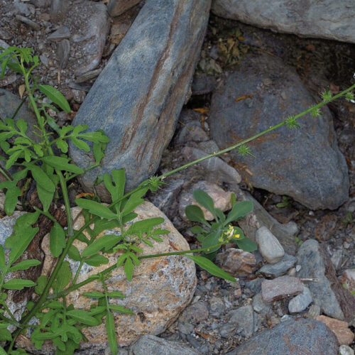 Tallo ramificado, con ramas de erectas a flexuo-sas, glabras o con algún pelo simple. Hojas 1,5–20 x 1–12 cm, alternas, pecioladas, de pinnatipartidas a bipinnatisectas, con hasta 4 pares de segmentos laterales, apiculados, de margen esparcidamente ciliado. Racimos ebracteados, laxos, con 14–30 flores. Flores actinomorfas, hermafroditas, tetrámeras; sépalos 3–4 mm, erectos; pétalos 6–9 x 2–3 mm, espatulados, amarillos, con venas más oscuras; estambres 6, tetra-dínamos. Frutos en silícula, con 2 artejos, el inferior de 5–7 mm de diámetro, subgloboso, cubierto de espinas cónicas de 1–3 mm, dehis-cente, con 2 lóculos monospermos; y el superior (rostro) 5–9 mm, estrechamente cónico. Semillas 2–2,5 mm, subesferoidales, finamente alveoladas, negruzcas