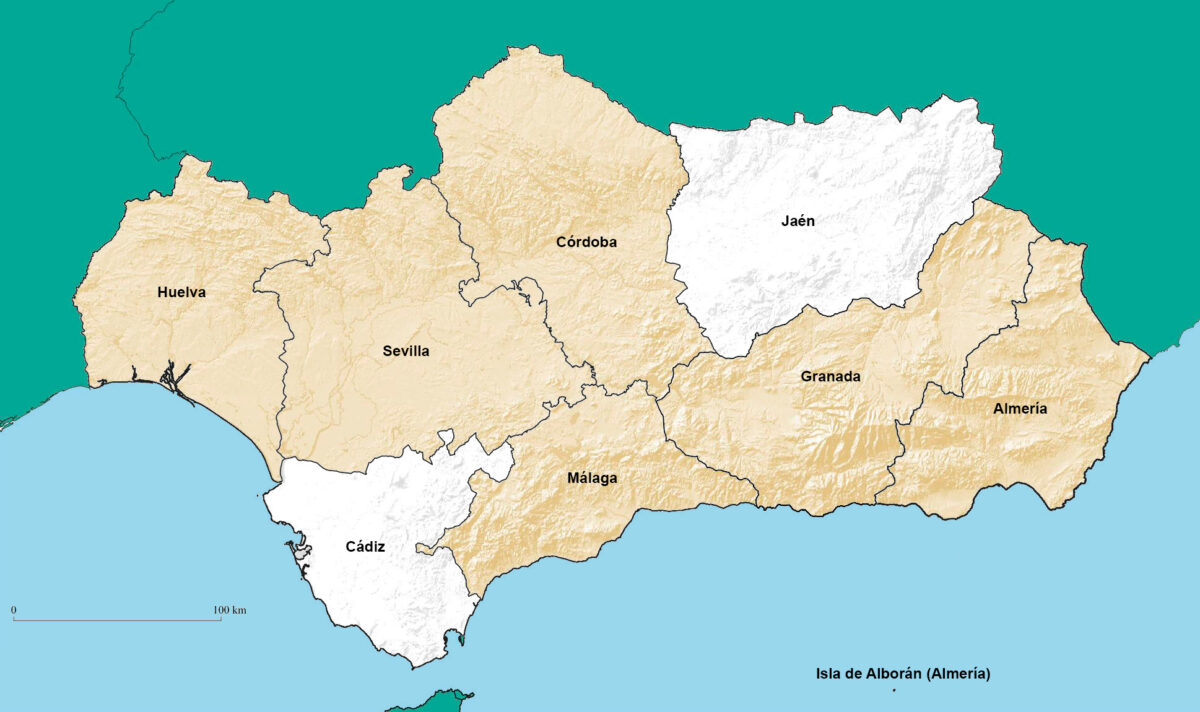 Almería, Córdoba, Granada, Huelva, Málaga, Sevilla
