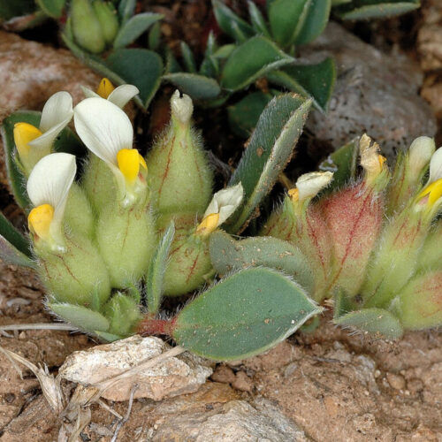Tallos decumbentes, difusos, pelosos. Hojas con (1)3–5 folíolos, con indumento adpreso; folíolos laterales estrechamente elípticos u oblanceolados, el terminal 10–30(40) x 7–20(30) mm, obovado o suborbicular. Fascículos axilares, cortamente pedunculados o subsentados, con 2–6 flores. Flores hasta 25 mm, papilionadas. Cáliz fusiforme antes de la antesis, acrescente, progresivamente hinchado, finalmente de hasta 23 x 12 mm y ventricoso en la fructificación, papiráceo, seríceo. Corola con estandarte de 16–18 x c. 4 mm, amarillo pálido, a menudo con la venación rosada, piloso en el dorso; alas amarillas; quilla tan larga o algo más corta que las alas, blanquecina, a menudo con el ápice purpúreo. Androceo diadelfo. Ovario peloso. Legumbre 8–10 x c. 3 mm, constreñida en el centro, apiculada, pelosa, de ordinario disperma, por excepción monosperma