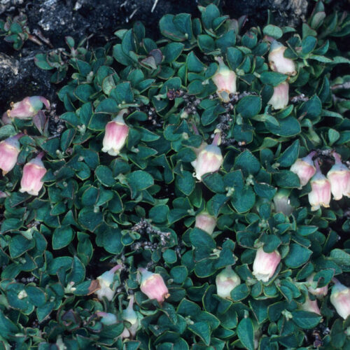 Matillas postradas, densamente ramificadas, a veces radicantes; tallos jóvenes cilíndricos, a veces pubérulos, grisáceos. Hojas 3–10 mm, alternas, subsentadas, obovadas, planas, enteras, glaucas. Inflorescencias en racimos axilares, con 1–2 flores; pedicelos 1–2 mm, más cortos que la corola, reflejos. Flores actinomorfas, hermafroditas, pentámeras; cáliz acampanado, lobulado; corola 3–4 x c. 2,5 mm, urceolado–cilíndrica, con lóbulos cortos y recurvados, blanco–purpúrea; estambres 10, con anteras inclusas, apendiculadas; ovario ínfero, con estilo inserto. Baya 3–5 mm, globosa, negro–azulada