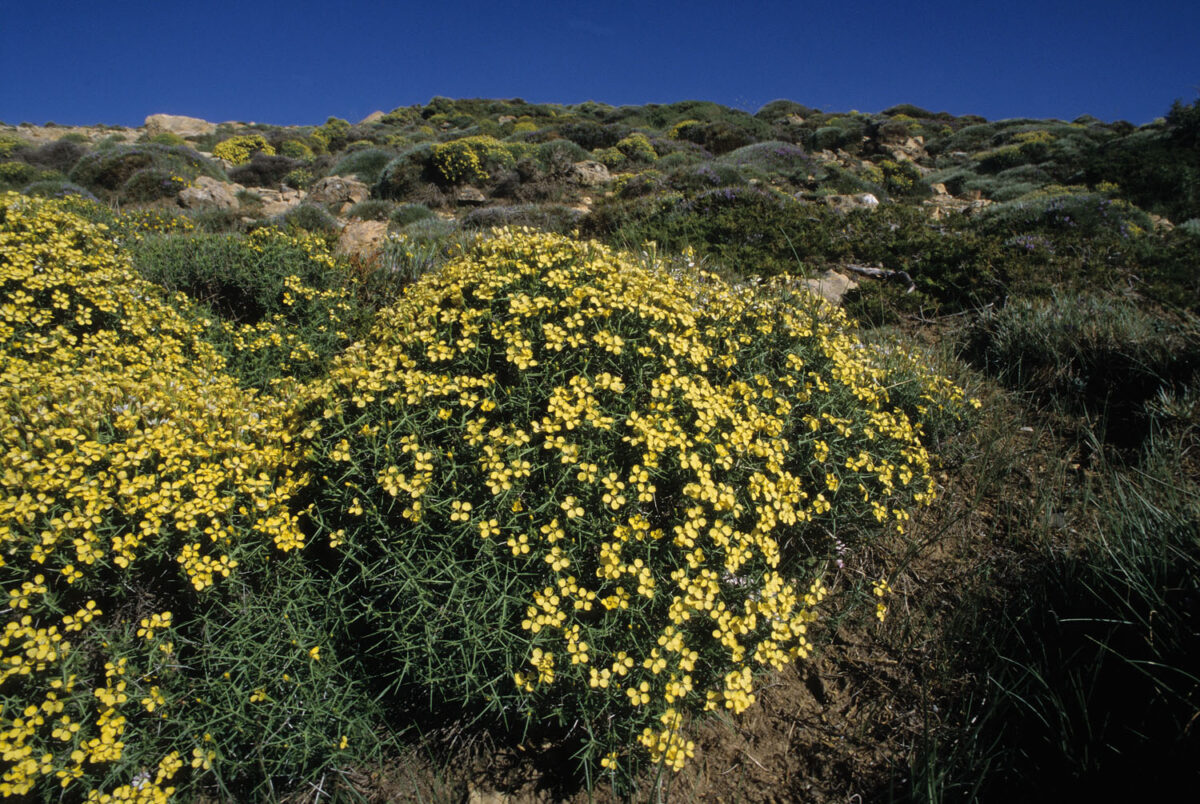 Matas pulvinulares, espinosas, glabrescentes o setoso–escábridas, con pelos simples. Tallos muy ramificados, densamente intricados, de corteza blanquecina, con espinas de 4–20 mm, rígidas y patentes. Hojas 3–14 x 1–2 mm, lineares, setoso–híspidas al menos en el margen hacia la base. Racimos ebracteados, cortos, paucifloros (3–5 flores). Flores actinomorfas, hermafroditas, tetrámeras; sépalos 5–7 mm, erectos, ligeramente concrescentes en la parte media, setoso–híspidos al menos en el ápice; pétalos 8–16 x 5–7 mm, con limbo de suborbicular a obovado y uña c. 10 mm, de amarillos a blanquecinos, con venas púrpuras; estambres 6, tetradínamos. Frutos en silícula angustisepta, con 2 artejos, el inferior de 3–5(7) x 2–4 mm, elipsoidal, reticulado en el ápice, glabro; artejo superior 5–8 x 2–4 mm, lingüiforme, agudo, glabro. Semillas 1 por lóculo, de 2–3 mm, subglobosas, pardo–rojizas