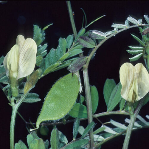 Laxamente hírtula, con pelos ligeramente tuberculados. Hojas 35–70 mm, con 4–7 pares de folíolos, terminadas en un zarcillo ramificado; estípulas hemihastadas, con borde entero o inciso–dentado, con un nectario oscuro; folíolos 4–18 x 2–10 mm, obcordiformes, oblanceolados, elípticos u oblongo–elípticos, truncados o emarginados, mucronados. Flores 18–25 mm, papilionadas, axilares, solitarias, con pedicelo de 1–2 mm que nace directamente del tallo o de un pedúnculo de c. 0,5 mm. Cáliz 8–10,5 mm, zigomorfo; dientes poco desiguales, más cortos que el tubo, estrechamente triangulares, ± subulados, los superiores 2–3,5 mm, los inferiores 3–5 mm. Pétalos amarillos con venas verdosas, parduscos al secarse; estandarte pubescente. Legumbre 27–32 x 9–11 mm, subromboidea, fusiforme o elipsoidea, comprimida, estipitada, laxamente pubescente, con pelos de 1–2 mm, erectos o adpresos, con 2–5 semillas. Semillas 2,5–4 mm; hilo c. 1,6 mm, 1/8–1/6 del contorno de la semilla