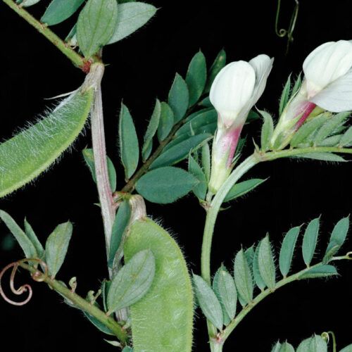 Laxamente pubescente o glabrescente, con pelos tuberculados y erectos. Hojas 15–65 mm, con 3–9 pares de folíolos, terminadas en un zarcillo ramificado; estípulas hemihastadas o no, con el borde entero, con un nectario oscuro en la cara abaxial; folíolos (4)6–27 x 1,5–5,5(6,5) mm, elípticos u oblongo–elípticos, de obtuso–mucronados a subagudo–apiculados. Flores 19–28 mm, papilionadas, axilares, solitarias, en parejas o en grupos de tres. Cáliz 7,5–16,5 mm, zigomorfo; dientes desiguales, estrechamente triangulares, ± subulados, los superiores 1,5–4 mm, más cortos que el tubo, los inferiores 2,5–9,5 mm, más largos o más cortos que el tubo. Pétalos blanquecino o amarillentos, +/- teñidos de rosa o púrpura, en la desecación pardo claro o azul violeta; estandarte glabro. Legumbre 25–43 x 7,5–12 mm, subromboidea, fusiforme u oblongo–elipsoidea, muy comprimida, con estípite de 2–3 mm, glabra o con pelos provistos de un tubérculo basal menor de 0,3 mm, esferoideo, con 2–4 semillas. Semillas 2,4–6,5 mm; hilo 1,2–4 mm, 1/9–1/3 del contorno de la semilla
