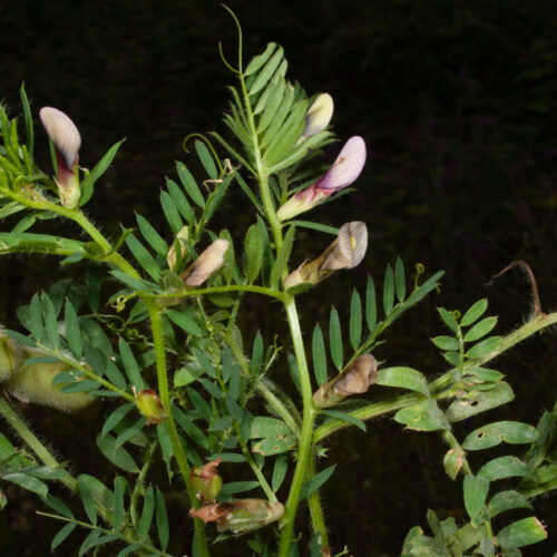 Laxamente pubescente o glabrescente, con pelos tuberculados y erectos. Hojas 15–65 mm, con 3–9 pares de folíolos, terminadas en un zarcillo ramificado; estípulas hemihastadas o no, con el borde entero, con un nectario oscuro en la cara abaxial; folíolos (4)6–27 x 1,5–5,5(6,5) mm, elípticos u oblongo–elípticos, de obtuso–mucronados a subagudo–apiculados. Flores 19–28 mm, papilionadas, axilares, solitarias, en parejas o en grupos de tres. Cáliz 7,5–16,5 mm, zigomorfo; dientes desiguales, estrechamente triangulares, ± subulados, los superiores 1,5–4 mm, más cortos que el tubo, los inferiores 2,5–9,5 mm, más largos o más cortos que el tubo. Pétalos rosados, teñidos de púrpura, tras la desecación violáceos; estandarte glabro. Legumbre 25–43 x 7,5–12 mm, subromboidea, fusiforme u oblongo–elipsoidea, muy comprimida, con estípite de 2–3 mm, densamente serícea o hirsuta, con 6–10 pelos por mm2, con 2–4 semillas. Semillas 2,4–6,5 mm; hilo 1,2–4 mm, 1/9–1/3 del contorno de la semilla