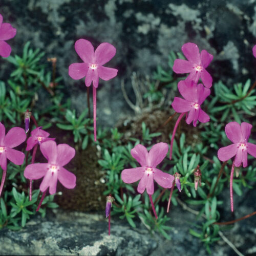Cepa leñosa, engrosada, que emite numerosos tallos lignificados en la parte inferior, erectos o ascendentes, gráciles, rojizos, foliosos en la porción superior. Hojas (5)7–15 x 1–2 mm, linear–lanceoladas, sésiles, glabras, con punteaduras rojizas; estípulas similares a las hojas, las superiores indivisas, las de las hojas medias e inferiores alguna vez bisectas o trisectas. Flores solitarias sobre pedúnculos bracteados, zigomorfas, hermafroditas, pentámeras, dialipétalas; sépalos 4–5 mm, lanceolados, agudos; pétalos mucho más largos que los sépalos, rosado–purpúreos, los laterales dirigidos hacia arriba, el inferior profundamente bilobado; espolón 20–30 mm, filiforme, recto o curvo, casi horizontal. Cápsula c. 5 x 4 mm, subovoidea, glabra; semillas c. 2,5 mm, de color castaño