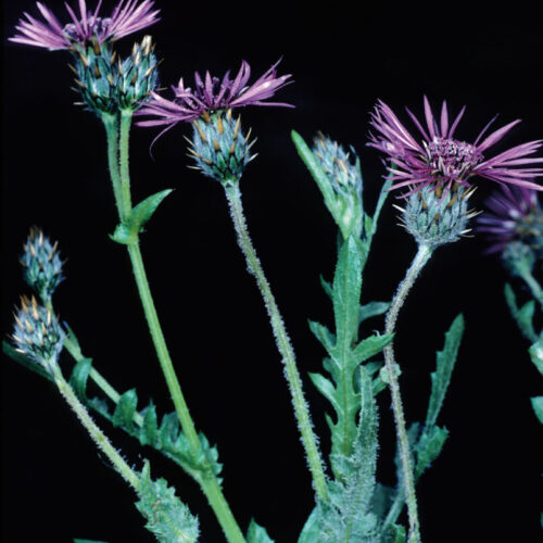 Anual o perennizante, papiloso–hírtula, algo escábrida. Tallos erectos, ramificados. Hojas alternas, pinnatipartidas o pinnatisectas; segmentos aserrados o dentados, el terminal más grande. Capítulos terminales, solitarios, pedunculados; involucro 12–17 x 7–12 mm, ovoideo–cilíndrico, viloso, con varias filas de brácteas de margen negruzco, las medias con apéndice apical triangular de 2–3 mm, pardusco o pajizo; receptáculo peloso. Flores flosculosas, purpúreas–oscuras, las externas neutras, radiadas, las internas hermafroditas. Aquenios 3–3,8 mm, oblongoideos, adelgazados en la base, con costillas poco marcadas, vilosos, con corónula apical denticulada; vilano 2,5–3,5 mm, de varias filas de escamas lineares, denticuladas